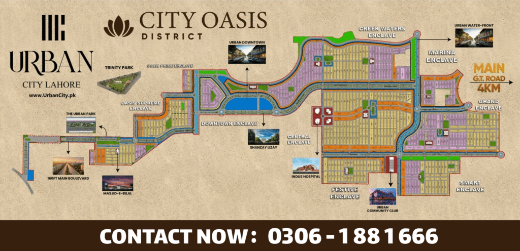 Urban City Lahore has unveiled the highly anticipated Master Plan Map for its City Oasis Block following the balloting held on January 11, 2025. This meticulously designed layout highlights an exceptional blend of residential, commercial, and recreational spaces. Key features include the 160-foot-wide Main Boulevard, Trinity Park, Urban Park, and Oasis Supreme Enclave, offering serene living and vibrant community hubs. The Downtown Enclave, Shanzay Lizay, and Urban Waterfront promise unmatched commercial and lifestyle opportunities, while essential landmarks like Masjid-e-Bilal and the Indus Hospital ensure convenience and accessibility. Strategically located just 4 km from Main GT Road, this master plan emphasizes connectivity, modern infrastructure, and future growth potential.